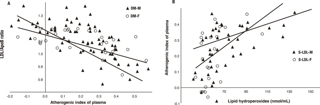 An LDL/ApoB < 1.2 (p < 0.05) was observed in 67% of male and female patients with DM. Although triglyceride levels did not differ between men and women, women had higher levels of total cholesterol (p < 0.05) and LDL cholesterol (p < 0.01) than men. Among women with LDL/ApoB < 1.2, strong correlations were observed between values of lipid hydroperoxides (LOOH) and atherogenic index of plasma (p < 0.005) and between levels of triglycerides and LOOH (p < 0.005) and ApoB (p < 0.0001).