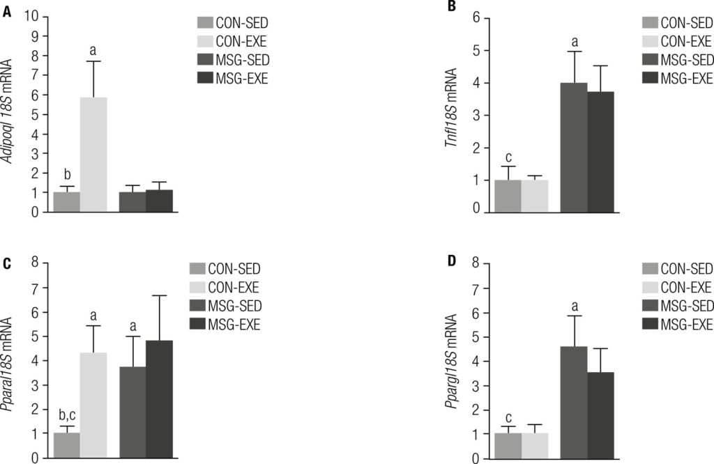 Obesity was induced by neonatal MSG administration. Exercised rats (MSG and control) were subjected to swim training for 30 min for 10 weeks, whereas their respective controls remained sedentary. Total RNA was obtained from sections of the mesenteric adipose tissue of the rats. mRNA levels of adiponectin (Adipoq), tumor necrosis factor alpha (Tnf), peroxisome proliferator-activated receptor alpha (Ppara), and peroxisome proliferator-activated receptor gamma (Pparg) adipokines were quantified by quantitative Real-Time Polymerase Chain Reaction (qRT-PCR).