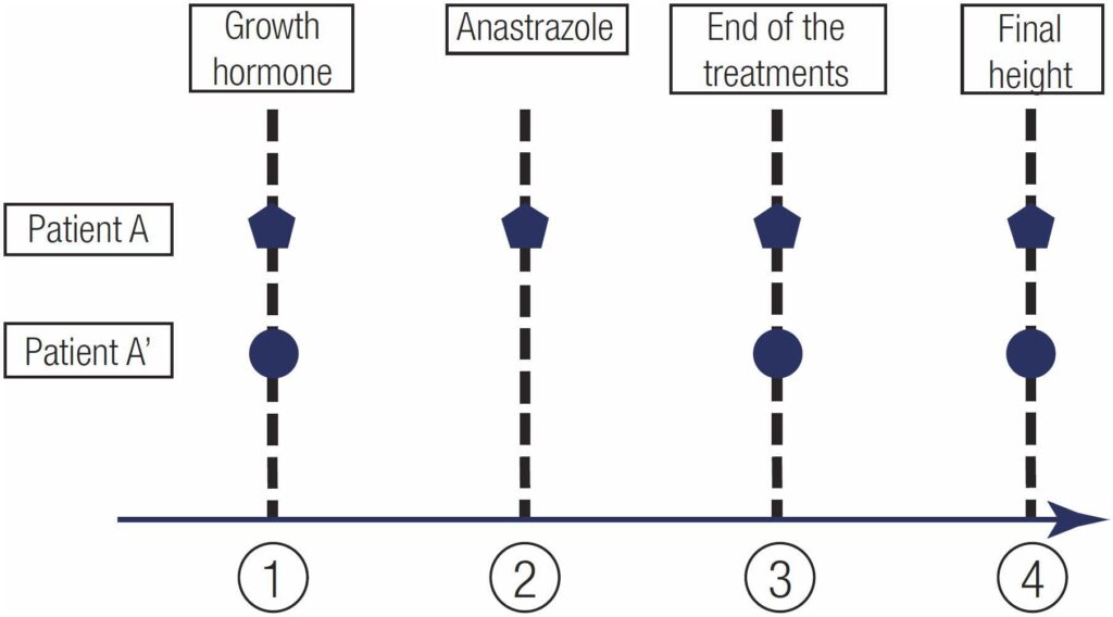 Pubertal boys who received both GH and anastrozole (GH+A) were one-to-one matched with boys who received only GH (GH-Only) for chronological and bone age, pubertal stage and height before the GH initiation, treatment duration and midparental height. Anthropometric measurements throughout treatment and adult heights were compared between the groups. Sex hormone levels were evaluated longitudinally in the GH+A group.
