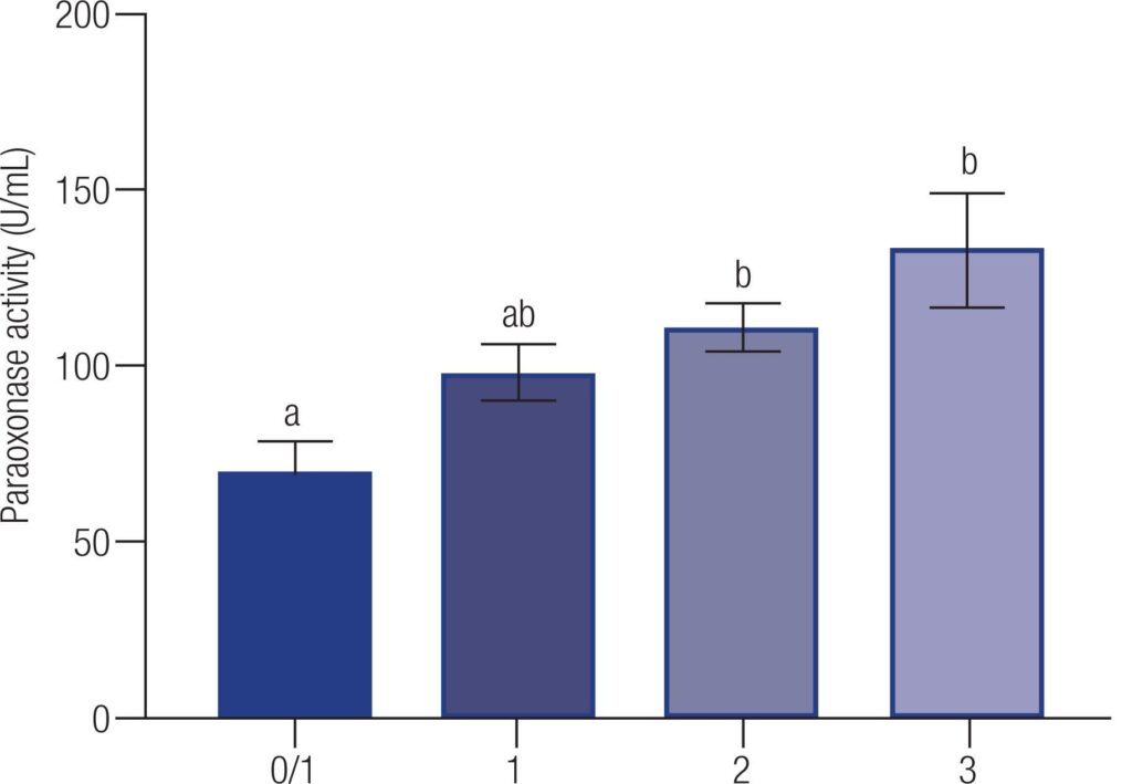 Genotypic distribution for L55M SNP was 56% for the LL genotype, 32% for LM and 12% for MM; for the PON1 C(-107)T SNP it was 28% for the TT genotype, 41% for CT and 31% for CC. Individuals with C and L alleles had higher serum PON1 activity. Combining the two SNPs, we observed that individuals carrying the LL and CC genotypes had twice the activity of carriers of the TT and MM genotypes. Considering food intake, no significant difference was observed between genotypes and intake levels.