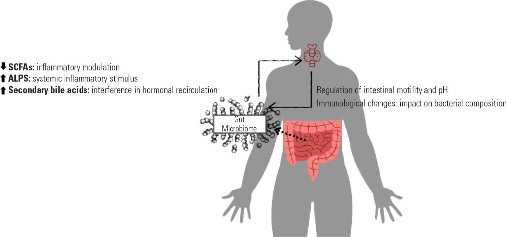 The thyroid-gut axis represents a dynamic interaction between the intestinal microbiota and thyroid function, with growing evidence linking gut dysbiosis to thyroid diseases. The gut microbiome, comprising over 100 trillion microorganisms, influences immune modulation, iodine metabolism, and thyroid hormone regulation. Short-chain fatty acids, produced by beneficial gut bacteria, support immune homeostasis and thyroid function, while pathogenic bacteria and lipopolysaccharides trigger inflammatory pathways that impair thyroid activity. Alterations in gut microbiota composition have been associated with autoimmune thyroid diseases, including Hashimoto’s thyroiditis and Graves’ disease. Dysbiosis increases intestinal permeability, antigen exposure, and immune activation, exacerbating thyroid autoimmunity. A reduction in short-chain fatty acids-producing bacteria weakens immune tolerance, promoting inflammatory cytokine release and autoantibody production. Recent studies highlight microbial metabolites such as tryptophan derivatives and their role in immune regulation. Gut dysbiosis is also implicated in thyroid nodules and cancer. Decreased butyrate-producing bacteria and increased inflammatory bacterial taxa have been observed in thyroid malignancies. Microbiota influence iodine and selenium bioavailability, essential for thyroid hormone synthesis, and modulate sodium-iodide symporter expression, affecting thyroid cancer response to radioactive iodine therapy. Microbiome-targeted interventions, including probiotics, prebiotics, dietary modifications, and fecal microbiota transplantation, may restore microbial balance, enhance immune regulation, and improve thyroid treatments. This review synthesizes our current understanding of the thyroid-gut axis, indicating that the intestinal microbiota and its metabolites may act directly or indirectly on the thyroid gland, highlighting potential clinical implications and paving the way for therapeutic strategies targeting the intestinal microbiota.