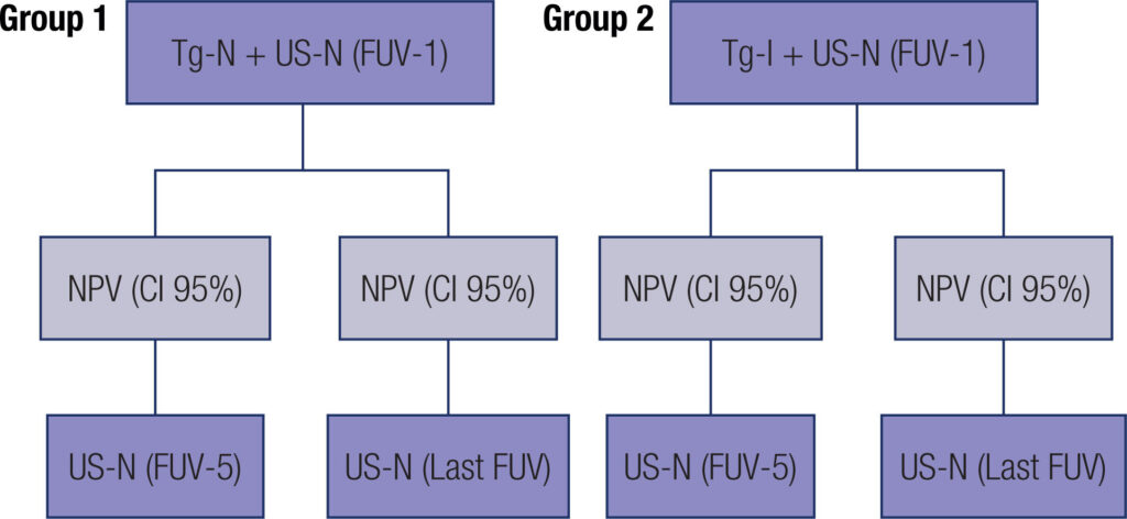 We conducted a retrospective longitudinal study of patients with low- and intermediate-risk PTC with normal neck US, unstimulated serum thyroglobulin (Tg) < 1 ng/mL and negative anti-Tg antibodies at the one-year follow-up. Patients were divided into group 1 [undetectable Tg (<0.20 ng/mL)] and group 2 [detectable Tg but < 1 ng/mL]. The negative predictive value (NPV) of the one-year unstimulated Tg at the five-year and last follow-up visits was calculated.