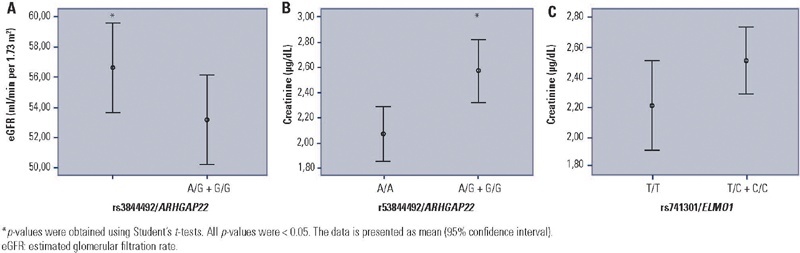 The frequency of the rs3844492/ARHGAP22 G/G genotype was 16.8% in the control group and 15.7% in cases (p = 0.069). After adjusting for covariables, the presence of the G allele was associated with risk for diabetic kidney disease (OR = 1.435, 95% CI 1.023 – 2.011; p = 0.036), as well as with a decreased estimated glomerular filtration rate (p = 0.012) and elevated creatinine levels (p = 0.009). No difference was observed in the rs741301/ELMO1 genotype frequencies between groups (p = 0.800). However, the presence of the C allele appears to be associated with higher creatinine levels in patients with type 2 diabetes mellitus (p = 0.064).
