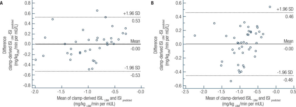 In the multivariable linear regression analysis, adjusted for sex, age, and waist circumference, the HOMA-IR was independently and negatively associated with the clamp-derived insulin sensitivity index in both pubertal (unstandardized coefficient – B = −0.087, 95% confidence interval [CI] = −0.135 to −0.040) and postpubertal (B = −0.101, 95% CI, −0.145 to −0.058) adolescents. Bland-Altman plots showed agreement between the predicted insulin sensitivity index and measured clamp-derived insulin sensitivity index in both pubertal stages (mean = −0.00 for pubertal and postpubertal); all P > 0.05. The HOMA-IR showed a good discriminatory power for detecting IR with an area under the receiver operator characteristic curve of 0.870 (95% CI, 0.718-0.957) in pubertal and 0.861 (95% CI, 0.721-0.947) in postpubertal adolescents; all P < 0.001. The optimal cutoff values of the HOMA-IR for detecting IR were > 3.22 (sensitivity, 85.7; 95% CI, 57.2-98.2; specificity, 82.6; 95% CI, 61.2-95.0) for pubertal and > 2.91 (sensitivity, 63.6; 95% CI, 30.8-89.1, specificity, 93.7; 95%CI, 79.2-99.2) for postpubertal adolescents.