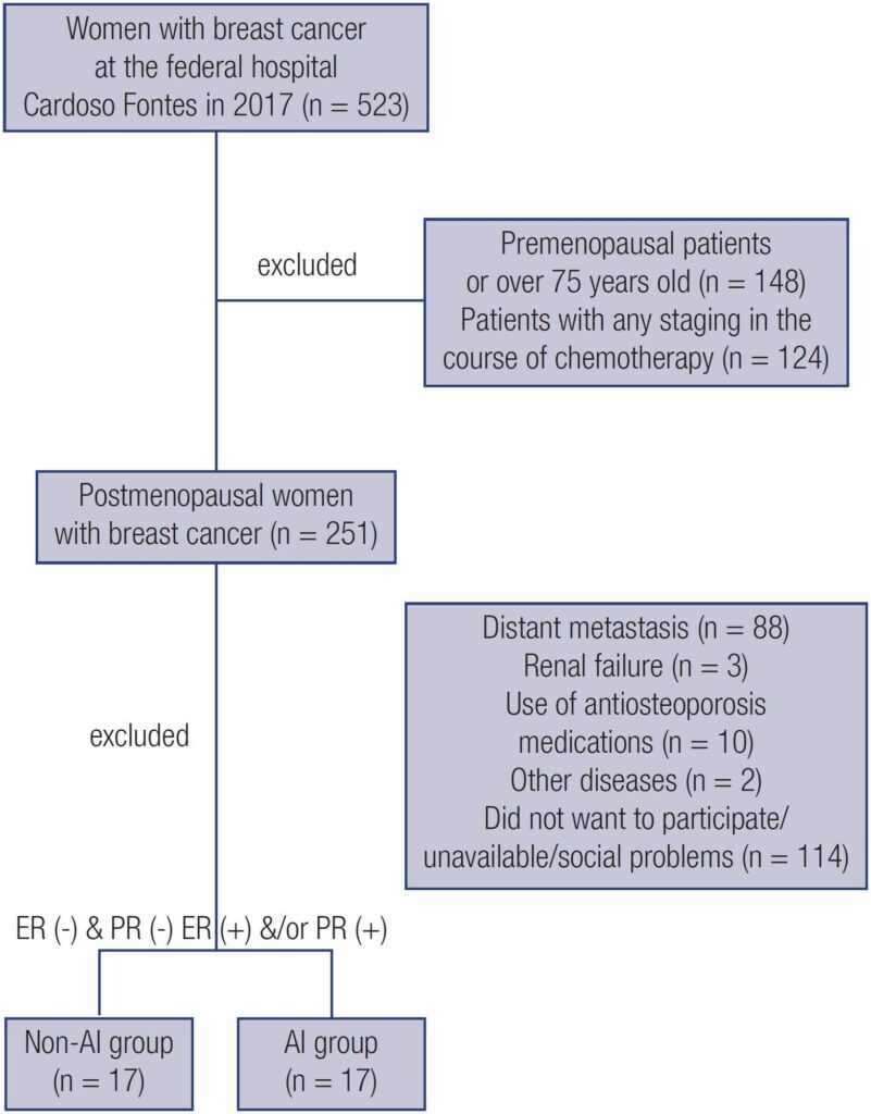 Thirty-four postmenopausal women with BC, without bone metastasis, renal function impairment and who were not receiving bone-active drugs were selected from a population of 523 outpatients treated for BC. According to the presence of hormonal receptors, HER2 and Ki67, seventeen had positive hormonal receptors and received anastrozole (AI group), and seventeen were triple-negative receptors (non-AI group), previously treated with chemotherapy. Areal bone mineral density (aBMD) and vertebral fracture assessment (VFA) analyses were performed by DXA; vBMD and bone microarchitecture were evaluated by HR-pQCT. Fracture risk was estimated using the FRAX tool.