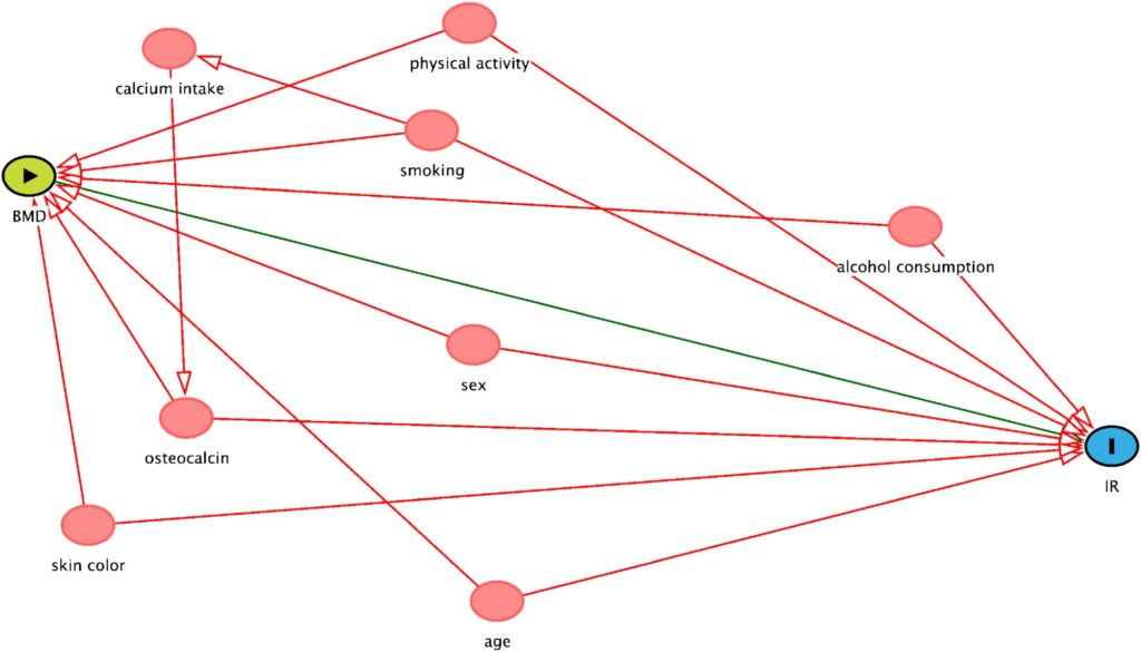 Cross-sectional analysis with 468 young adults from the fourth follow-up of the 1978/79 Ribeirão Preto prospective birth cohort, Brazil. BMD, total osteocalcin (OC), fasting plasma glucose and insulin concentrations were assessed. IR, sensitivity (S) and secretion (β) were estimated by homeostasis model assessment (HOMA) indexes. Multiple linear regression models were constructed to estimate the association between BMD and glucose metabolism. Beta coefficient, R2 and p-values were provided. WC was tested as an effect modifier and OC as a confounder. The covariates were selected based on Direct Acyclic Graph.